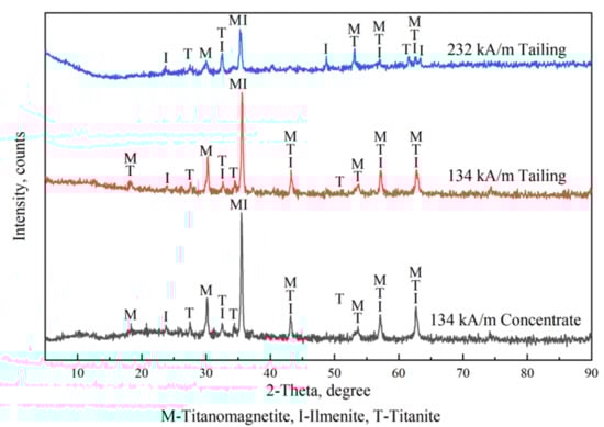 The XRD patterns of the products generated by LVTC grinding for 20 min followed by magnetic separation are shown in Figure 13, revealing that titanomagnetite, ilmenite, and titanite are still the predominant phases in all magnetic separation products at an optimal grinding time of 20 min, but the intensity or content of these three minerals varies between magnetic separation products. In the 232 kA/m tailings, the intensity of these three minerals is weaker than in the 134 kA/m magnetic concentrate and tailings, and there are additional peaks of ilmenite and titanite, indicating that several magnetic minerals and gangue can be separated under a magnetic field strength of 232 kA/m. However, there is no difference in peak shapes between 134 kA/m tailings and concentrate, and the common peaks of ilmenite and titanomagnetite continuously appear, indicating that the separation efficiency of LVTC is greatly limited at 134 kA/m magnetic field strength. Therefore, the grade of TFe and TiO2 cannot be significantly improved by ordinary fine grinding and magnetic separation, because of LVTC’s special mineralogical properties. In this study, the optimal grinding time of LVTC was 20 min, and 232 kA/m magnetic field intensity had a higher separation efficiency than 134 kA/m magnetic field intensity.
