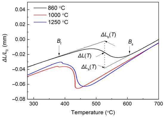Figure 4 shows the expansion curves for the lengths of the specimens treated with different austenitizing temperatures at a cooling rate of 10 °C/s. The bainite starting (Bs) and bainite finishing (Bf) temperatures were considered to be the temperatures corresponding to the deviation points of the thermal expansion lines of austenite and bainite on the expansion curves [10]. In Figure 4, the arrows show the Bs and Bf temperatures of the sample at the austenitization temperature of 860 °C. The measured Bs temperature in the specimen austenitized at 860 °C is approximately 606 °C. The theoretical Bs was calculated to be about 642 °C using Equation (1) proposed by van Bohemen [25]. The theoretical Bs is higher than the experimentally determined one because incubation is required to start the transformation. It is observed that the austenitizing temperature obviously affects the bainite transformation.