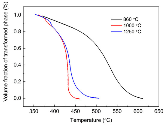 Transformation kinetic curves further indicate that the austenite grain in the sample austenitized at 1000 °C reduces the bainite transformation temperature ranges. And the length of bainite sheaves obtained from the sample austenitized at 1000 °C is close to the diameter of AGS (see Figure 2). Furthermore, the phase transformation rate of the specimen with an austenitizing temperature of 860 °C decreases significantly near the intermediate stage of transformation, which is mainly caused by the enrichment of carbon in austenite discharged from polygonal ferrite. Thus, the phase transformation kinetics are influenced to some extent by the diffusion of carbon at the end of the phase transformation [28,29].