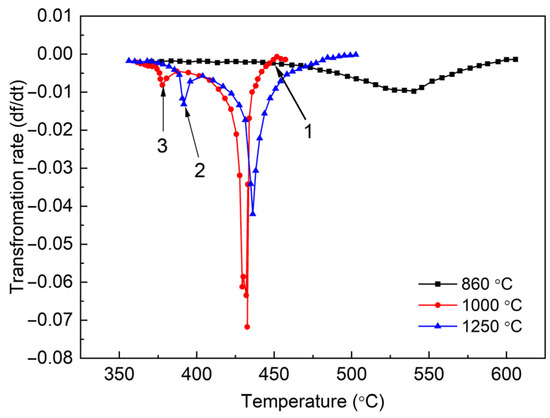 Phase transformation rate versus cooling temperature for the experimental steel at different austenitization temperatures. Arrow 1 indicates the transformation stasis at the beginning of transformation. Arrows 2 and 3 indicate the second peak in the transformation rate curves.