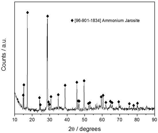 The obtained ammonium-sodium jarosite with arsenic presented a similar morphology and microstructure to those reported for arsenical potassium jarosite and sodium jarosite with arsenic [13,19]. Assessment of the obtained X-ray diffraction spectrum was conducted using Match Version 3. (Crystal Impact, Dr. H. Putz and Dr. K. Brandenburg GbR, Kreuzherrrenstr, Bonn, Germany), which contains the International Center for Diffraction Data-Power Diffraction Files (ICDD-PDF). The intensity of the peaks shown in Figure 2 suggested the presence of crystallographic planes typical of ammonium jarosite, albeit slightly shifted to the left due to the unit cell’s expansion caused by the incorporation of the arsenate ion (AsO43−) [22]. No other compounds were identified, as there were no additional intense peaks.