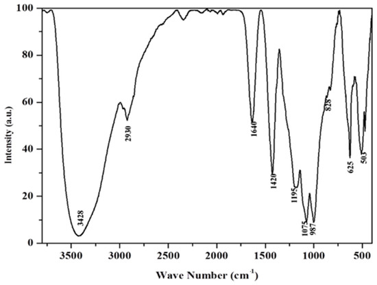 For infrared spectroscopy analyses, the spectrum (400–4000 cm−1) was obtained in transmission mode after the preparation of the KBr pellet (Figure 3). The intense absorption in the region between 2600 and 3800 cm−1 was attributed to the lengthening of the bond O–H (νOH). Due to increase in the bond energy of hydrogen with the mineral structure, this band changes to lower frequencies for Pb-jarosite (3352 cm−1), Pb-As-jarosite (3343 cm−1), Na-jarosite (3365 cm−1), and increases for K-jarosite (3385 cm−1) [18]. The band observed at 1640 cm−1 was attributed to the deformation of the bond H–O–H. The band shown at 625 cm−1 was attributed to the v4 bond mode of SO42−. Next, three intense absorption bands were observed near 1195, 1075 and 987 cm−1, which were attributed (respectively) to the ν3 (double) and ν1 vibrations of the sulfates. The spectral band at 1640 cm−1 corresponded to the flexion movement of water molecules. The band at 1420 cm−1 belonged to the bond N–H. The band at 828 cm−1 established the presence of the functional group As−O. The signal at 503 cm−1 was attributed to the vibration of the octahedral coordination of FeO6.