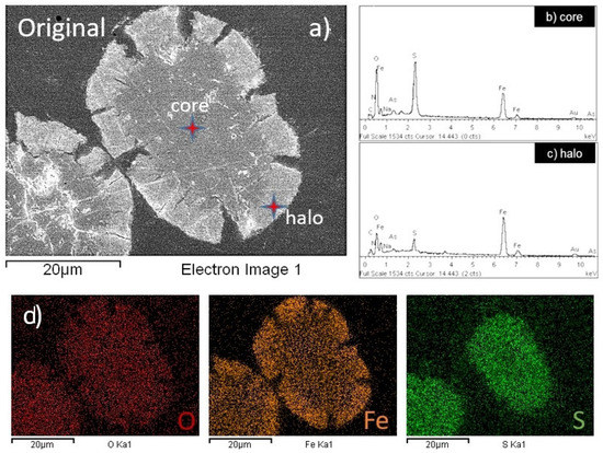 The decomposition solution was analyzed at different time intervals to determine the controlling stage that describes the decomposition of ammonium-sodium jarosite with arsenic in NaOH media. A kinetic model was also determined, and the solid residues were characterized by SEM-EDS whereby an image of a partially decomposed particle was produced (Figure 5), showing a reaction front, unreacted core, and an ash layer of solid byproducts (Figure 5a). EDS analyses showed that in the core Na, S, Fe, O and As were present, meaning that these had remained unreacted; Fe, O and As could be identified in the ash layer (Figure 5c). Figure 5d (X-ray mapping results) showed that Fe and O were present throughout particles, while S could only be seen in the core, indicating that they had diffused into the solution. Although NH4 and Na were not detected in the mapping analyses due to their low concentration, the described behavior indicated that these species had also diffused into the solution. According to the results of the SEM-EDS analysis of partially decomposed particles, in this process arsenic was adsorbed as AsO43− by the solid residues made of Fe(OH)3. The As adsorbed in the iron hydroxide was not released into the solution at times after the total decomposition of ammonium-sodium jarosite with As in alkaline media. This would reduce the bioavailability of arsenic in natural environments with alkaline pH, such as seawater and underground water.