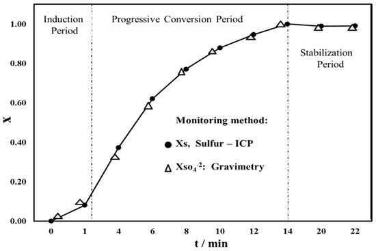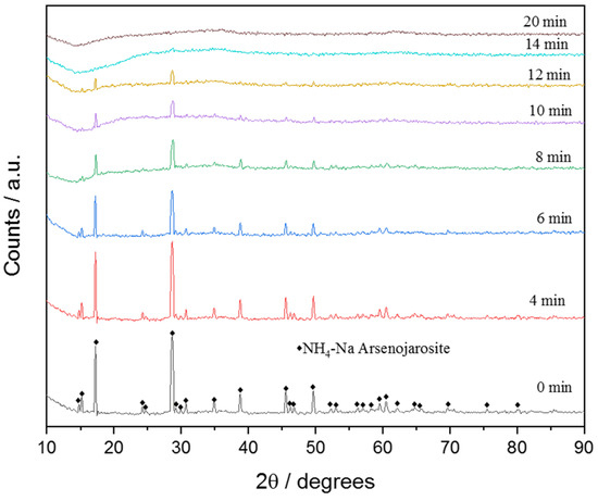 In other studies on the decomposition of jarosite compounds with and without arsenic, it was found that the reaction was characterized by the release of Na+ and SO42− ions from the jarosite structure to the solution [13,14,15,16,17,19]. Therefore, samples of the solution were taken at different times (≈5 mL) to monitor the progress of the reaction according to the conditions of each experiment. Sulfur was determined by ICP. In addition, it was possible to monitor the progress of the reaction by gravimetrically determining SO42− as barium sulfate [18]. Through mass balance, alterations in the reaction volume, due to sample taking and reagent addition, were corrected.