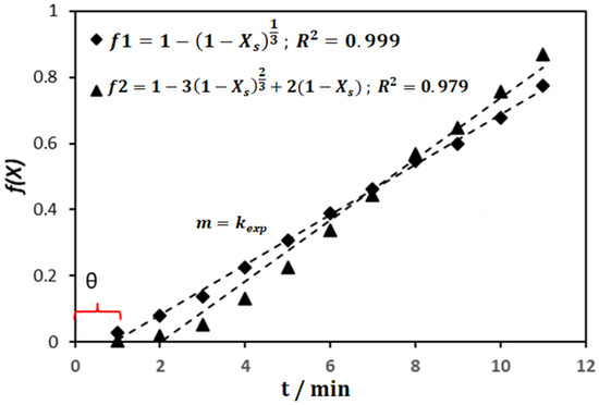 where X is a dimensionless number. Physically, it is the amount of decomposed ammonium-sodium jarosite with arsenic that has reacted; t is time and kexp is the experimental rate constant [26,27].