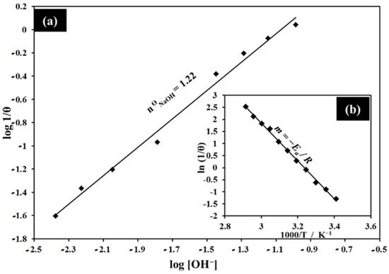 In NaOH media, the induction period (θ) increased as [OH−] diminished and tended towards zero at high concentrations of [OH−]. When representing the logarithm of 1/θ against the logarithm of [OH−], an order of reaction n = 1.22 was obtained. Figure 9a shows the dependence of the induction period with [OH−]. The Arrhenius equation determines the dependence of kq with temperature (Equation (8)).
