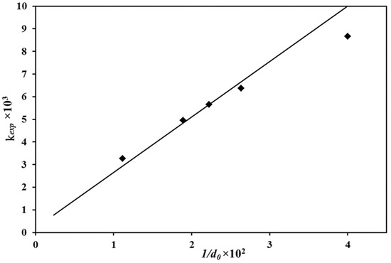 Figure 10 illustrates the dependence of kexp on the initial particle diameter d0. The particle diameter was inversely proportional to the experimental constant (kexp α 1/d0). The model that best describes the alkaline decomposition process of ammonium-sodium jarosite with arsenic after the progressive conversion period is the shrinking core model with chemical control.