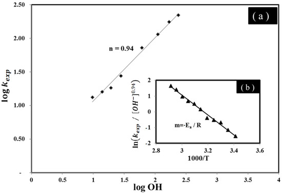 The experimental data of the alkaline decomposition are summarized in Table 5, representing the [OH−], particle size (d0) and temperature (T), as well as the induction time (θ) and kexp which were evaluated. In each experiment, the [OH−] was determined by considering the ionization constant of water (kw), pH of the solution and the working temperature [28].
