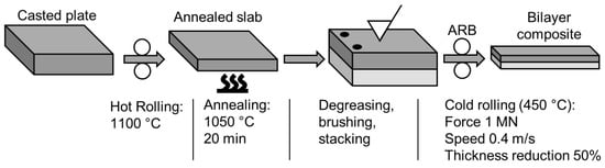 During hot rolling, an oxide film forms on the surface of metals due to thermally enhanced oxidation and hinders bonding []. To remove the oxide film, modern hot roll bonding methods are conducted under a vacuum [,]. In contrast, cold roll bonding (CRB) does not require a vacuum but does require work-hardening of the surface by brushing or grinding. The advantage of work-hardening is an earlier onset of adhesion than with unbrushed surfaces. Brushing also has the function of surface cleaning and activation (i.e., increase in surface tension []). During roll bonding, the hardened layers break-up and release the uncontaminated material, which is subjected to adhesive bonding []. CRB is easier, cheaper and allows successful bonding of various alloys, including interstitial-free steels [], stainless steels [] and even alloys of different base metals, such as Fe–Cu, Fe–Ag, Fe–Al [], Fe–Ti [], etc.