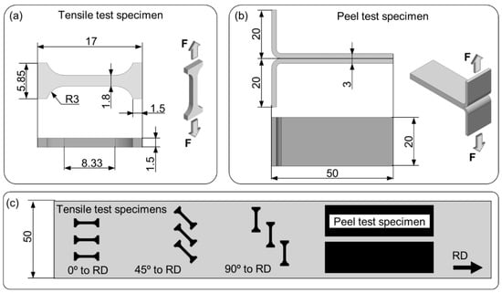 Geometry of specimens in mm for tensile (a) and T-peel (b) testing and their positions with respect to the rolling direction of the laminate (c).