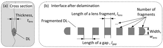 Some statistical insights can be obtained from the cross sections of bonding zones within the laminates, such as DL thickness demonstrated on Figure 3a. However, this information is too scarce, as we observe only a one-dimensional slice of the two-dimensional interface. To overcome this issue, delaminated surfaces after peel tests were used to quantitatively estimate sizes and distribution of DLs within the bonding zones of laminates (Figure 3b). In addition to thickness of DLs tlens, which can be obtained only from a cross section, an analysis of surfaces after delamination allows measuring of all the other parameters, such as length llens, width wlens, and total area Alens of DLs. One of the crucial parameters here is the length of gaps between DLs fragments lgap—these are the areas where non-contaminated material comes to the surface and forms bonding.