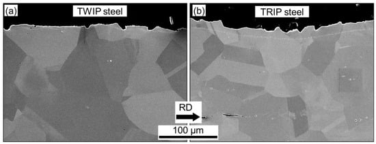 The microstructure of the TRIP and TWIP steels after hot rolling and subsequent heat treatment demonstrate full recrystallisation and no signs of strain hardening (Figure 4) []. Due to pickling the surfaces of both steels are scale- and oxide-free. Shallow etching pits are located in the areas where grain boundaries come to the surface. The observed surface profile inhomogeneity is expected to influence the resulting thickness of the strain-hardened layer after brushing.