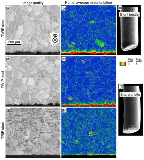 The influence of the brush tip geometry on the brushed surfaces of TWIP and TRIP steels was investigated using EBSD mapping and subsequent application of the Kernel average misorientation mapping with a maximum misorientation angle up to 5° between eight nearest neighbours of each measuring point (Figure 5, right column). Bristle tips of a worn-out (used) brush are round, which leads to the formation of the uneven work-hardened layer with the depth up to 50 µm after brushing (Figure 5a,b). Here, deformation lenses stick out from the surface, increasing the overall roughness of the TWIP steel. Brushing of TWIP steel with a sharpened brush provides a thicker and uniform work-hardened layer (up to 70 µm, Figure 5d,e). In this case lenses are embedded into the surface, making it smoother. Thus, a sharpened brush provides a thicker, smoother, and more uniform hardened layer.