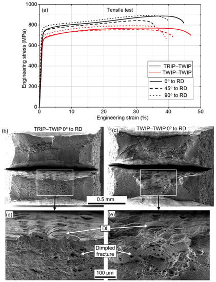 In general, the laminates show higher plasticity along the RD and higher strength perpendicular to RD. Regardless of the loading axis orientation, delamination occurs only during the final rupture of layers and only in the area of necking (Figure 6b,c), which indicates good bonding. The DLs embedded to the delaminated bonding zone can be clearly seen on the magnified views (Figure 6d,e). Both TRIP–TWIP and TWIP–TWIP laminates show 100% dimpled fracture surface, which indicates fully ductile fracture.