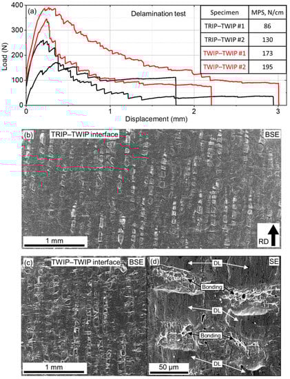 Results of the delamination testing of TRIP–TWIP and TWIP–TWIP bilayer laminates: load vs. displacement curves (a), and SEM images in BSE contrast with delaminated interfaces of TRIP–TWIP (b) and TWIP–TWIP (c) steels after delamination. The inset on (a) shows values of maximum peel strength (MPS) for each specimen. Magnified view of the TWIP–TWIP surface (SE contrast) indicates fragmented deformation lenses (“DL”) and bonding zones (“Bonding”) with white and black arrows, respectively (d).