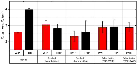 The roughness measurements of surfaces of TRIP and TWIP steels after pickling brushing and delamination are summarized on Figure 8. Despite the same treatment, the roughness parameter Ra of pickled TRIP and TWIP steels differs significantly: 4 and 2.6 µm, respectively. This difference is reduced after brushing. Brushing with blunted bristles result in Ra of 3.1 µm for TWIP steel and 2.8 µm for TWIP steel. Here, the roughness of TWIP steel increases with respect to the non-brushed state, which indicates that the material is rather unevenly smeared. Brushing with sharp bristles results in Ra of 2.3 µm for TWIP steel and 2.6 µm for TRIP steel, which indicates higher rate of smoothening for both steels. This result correlates with the position of DLs, which are embedded deeper in the surface of TWIP steel in case of brushing with sharp bristles (compare Figure 5b,e).