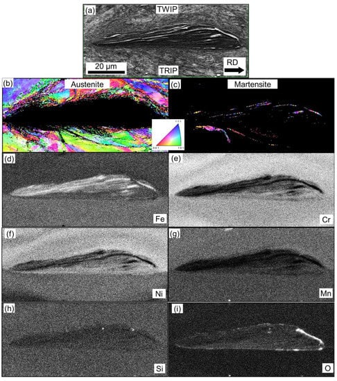 An example of a typical DL after ARB of TRIP–TWIP laminate is shown in Figure 9. A DL can be effectively revealed using BSE detection and appears as a dark region elongated along the bonding zone (Figure 9a). The matrix, which surrounds a DL, is fully austenitic within the TWIP steel (Figure 9b) and contains a few percent of α’ martensite within the TRIP steel (Figure 9c). The bright stripes within the DL consist of deformation-induced α’ martensite with the average grain size of 0.3 µm. Although there is an excessive amount of oxygen within a DL (Figure 9i), a DL is not an oxide, but a steel matrix after severe plastic deformation (SPD) with laminated structure of alternating Fe-rich (Figure 9d), and Ni-Mn-Cr-rich layers (Figure 9e–g). The amount of Mn in a DL is reduced with respect to the surrounding matrix.