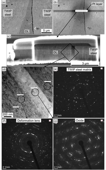 The fine structure of a DL and the surrounding material was investigated by means of TEM. A DL within the bonding zone of a TWIP–TWIP laminate was subjected to FIB on one of its sides, so that all characteristic areas (steel matrix, oxide, DL) would fit into a 7 µm width linear segment (Figure 10a). Before sectioning the surface of selected area was covered with Pd layer in order to protect the investigated material from the possible damage from FIB (Figure 10b). The region in extracted lamella (Figure 10c) was investigated by means of scanning transmission electron microscopy (STEM) and represents all three areas: DL on the left, an oxide layer in the middle, and a steel matrix on the right of Figure 10d.