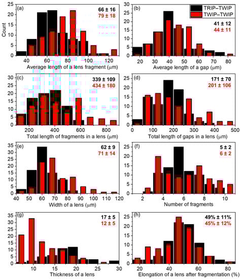 Distribution of geometrical parameters in absolute numbers (counts), measured manually from TRIP–TWIP (black bars) and TWIP–TWIP (red bars) interfaces after delamination. Numbers in the upper right corner of each diagram correspond to the average values and standard deviation. (a) Average length of a lens fragment, (b) average length of a gap, (c) total length of fragments in a lens, (d) total length of gaps in a lens, (e) width of a lens, (f) number of fragments, (g) thickness of a lens, (h) elongation of a lens after fragmentation.