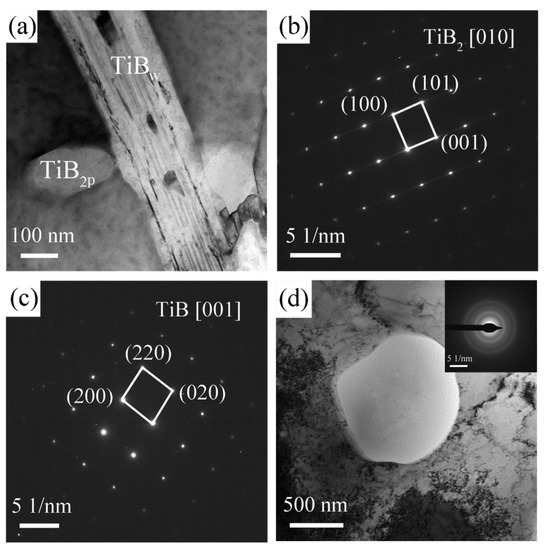 Figure 3 shows the TEM images of as-cast (TiB2p+TiBw)/Cu composites prepared at 1300 °C. It is found that two kinds of reinforcements with different morphologies are identified as TiB2p and TiBw. Moreover, unreacted B is found to exist in an amorphous form, as shown in Figure 3d. No other compound phase related to Ti is found and the remaining Ti may be dissolved into the Cu matrix, since the limit solid solubility of Ti in the Cu matrix (6.2 wt.%) is relatively higher.