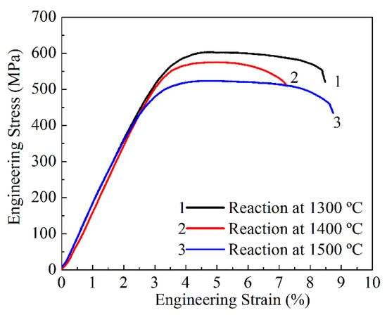 Figure 4 shows the tensile stress–strain curves of deformed (TiB2p+TiBw)/Cu composites at different reaction temperatures, and the measured electrical conductivity and tensile strength are gathered in Table 1. The conductivity of the composites increased significantly with the increase in reaction temperature, the conductivity increased from 73.1% IACS to 89.5% IACS when the reaction temperature increased from 1300 °C to 1500 °C, increased by 22.4%. Meanwhile, the tensile strength decreased from 606 MPa to 525 MPa and decreased by 13.4%. It can be concluded that the influence of the reaction temperature on the electrical conductivity and tensile strength is contradictory under the same post-treatment process, i.e., an increase in conductivity will sacrifice tensile strength.