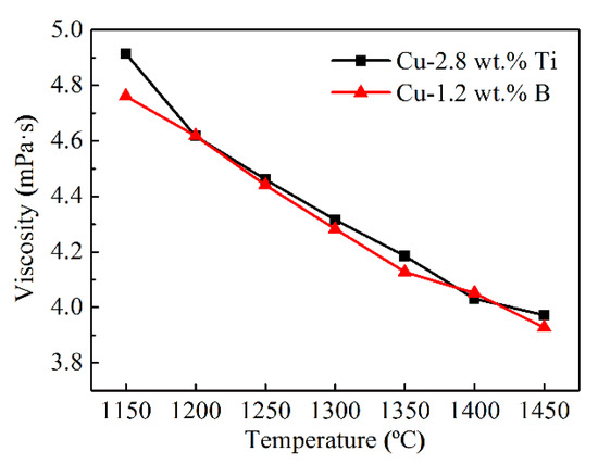 Viscosity–temperature curves of the molten Cu-B and Cu-Ti master alloys.