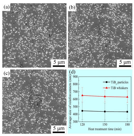 In addition to controlling the degree of in situ reaction at liquid state by reaction temperature, as discussed in Section 3.2, the study carried out by Sobhani et al. [18] shows that heat treatment is also an effective method to optimize the properties of TiB2/Cu composites, i.e., the residual Ti and B in Cu matrix may further react at solid state during heat treatment with a high temperature. Based on the above considerations, the effect of heat treatment time at 900 °C on the microstructures and properties of (TiB2p+TiBw)/Cu composites prepared at 1500 °C were studied. Figure 6 shows the microstructures of the (TiB2p+TiBw)/Cu composites with different heat treatment time (120 min, 150 min and 180 min). It is found that the morphologies and the average size of reinforcements formed by in situ reaction at liquid state have no obvious change with the increase in heat treatment time, which may be due to the size of the reinforcements generated by an in situ reaction at solid state, which is relatively small and makes it difficult to obtain quantitative data statistics through image processing.