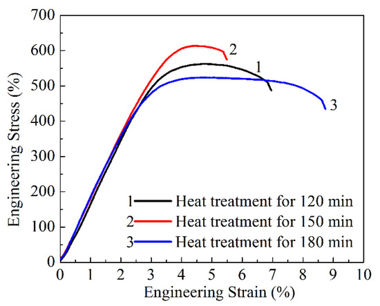 Meanwhile, the tensile strength of the composites increased first and then decreased with the increase in heat treatment time, which may be due to the trade-off among the reinforcements formed at solid state, Cu matrix grains and residual solutes. As for the increase in tensile strength, it may be dominated by the Orowan strengthening contributed by small reinforcements produced by in situ reaction at solid state [2]. Regarding the decrease in the tensile strength, it can be explained by considering the following two aspects. On the one hand, recrystallization coarsening may occur for the Cu matrix grains with the increase in heat treatment time; Supplementary Figure S2 shows that the matrix grains with heat treatment for 180 min are larger than with heat treatment for 120 min with the same post-treatment, and the refinement strengthening effect of the matrix grains decreases. On the other hand, the content of residual solute elements (especially Ti) in the matrix is reduced by thermal diffusion reaction under the action of long-time heat treatment, and the strengthening effect (such as solution strengthening of Ti) caused by the residual solutes is weakened.
