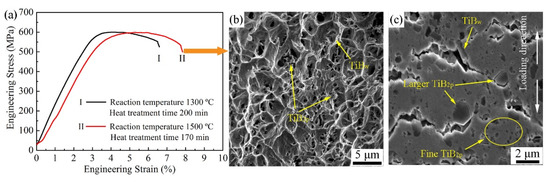 For preparation process I, when the composite prepared at 1300 °C with the heat treatment time increased from 180 min to 200 min, the electrical conductivity of the composite is increased from 73.1% IACS to 79.6% IACS, increasing by 8.9%, while the tensile strength of the composite is decreased from 606 MPa to 603 MPa, only decreasing by 0.5%. For preparation process II, when the composite prepared at 1500 °C with the heat treatment time decreased from 180 min to 170 min, the electrical conductivity of the composite decreased from 89.5% IACS to 83.7% IACS, decreasing by 6.5%, while the tensile strength of the composite is increased from 525 MPa to 602 MPa, increasing by 14.7%. In addition, many dimples, tearing ridges and debonded reinforcements were found in the fracture morphology of deformed composites, as shown in Figure 8b, which are typical characteristics of plastic fracture. Figure 8c shows the fracture morphology on the side of the tensile specimen. It was found that the cracks are easily generated from the interface of the reinforcements (especially the large size), and propagate along the interface of the reinforcements, and finally the reinforcements are debonded or pulled out. However, the probability of crack initiation and propagation is reduced around small reinforcements, since the stress concentration is lower around the small reinforcements [19,28,29], which delays crack initiation and propagation.