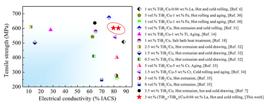 Finally, the electrical conductivity and tensile strength obtained through process I and process II are compared with other TiBy/Cu-X composites prepared by casting with different post-treatment [6,7,14,18,30,31,32,33,34,35], as shown in Figure 9. It was found that a synergistic regulation of electrical conductivity and tensile strength (80% IACS/600 MPa) are achieved through the optimization of the preparation process in this study. Therefore, the reaction temperature and heat treatment time can be used to control the degree of in situ reaction at liquid or solid state for (TiB2p+TiBw)/Cu composites, finally achieving synergistic regulation of electrical conductivity and tensile strength, which paves an avenue for the performance optimization of in situ metal matrix composites via reaction control and heat treatment.