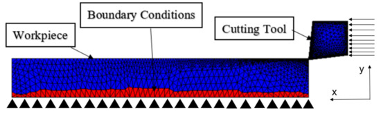 To simulate the machining forces and cutting temperature generated in the process, the AdvantEdgeTM 7.7, a numerical simulation software developed by Third Wave Systems USA, was employed. For workpiece modelling in AdvantEdgeTM software, the maximum workpiece length was 10 mm depending on the required convergence. Constraints were placed on the base and left side of the workpiece for boundary conditions, as shown in Figure 1. This was done so that the tool was constrained to move in the x-direction, and the workpiece was fixed. As a result, the cutting tool and workpiece would have a relative motion, which was the cutting speed. The boundary conditions for the cutting velocity and undeformed chip thickness of the tool were established on the reference point, which was at the cutting edge of the tool. The workpiece mesh and cutting tool mesh were created using a tri-element mesh. For improving the computational efficiency, the minimum and maximum mesh sizes of the workpiece were 20 μm and 100 μm, respectively, and were used in AdvantEdgeTM software.