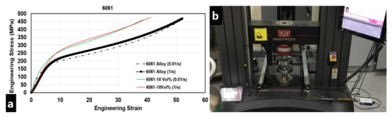 The plastic deformation behavior for the 6061 matrix was modelled using the Johnson–Cook material model. The JC model shows the dependency of the flow stress on strain, strain rate, and temperature. The constants for the model were obtained from stress–strain–temperature tests. A series of compression tests were conducted on squeeze-casted samples at different strain rates and temperatures using an Instron universal testing machine (see Figure 2b), from which the material model constants were determined. A representative stress–strain curve is shown in Figure 2a. Based on the experiments conducted at different temperatures and strain rates, quasi-static compression testing was used to calculate the yield stress (A = 150 MPa) and strain hardening parameters (B = 450 MPa and n = 0.39) at reference strain rate (1/s) and temperature (20 °C). Experiments conducted at different strain rates at constant temperature were used to determine the dimensionless strain rate sensitivity parameter (C = 0.012). Experiments performed at different temperatures and constant strain rate were used to determine the thermal softening coefficient (m = 0.5). The key properties of the 6061 matrix and the reinforcement hollow alumina shell (supplier data) and the properties of the cutting tool material which were used in AdvantEdgeTM are reported in Table 2 and Table 3, respectively.