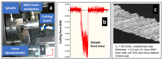 To validate the predicted force values of the 2D-FE model for metal syntactic foams, machining trials were carried out on 6061-based syntactic foams reinforced with hollow alumina shell (see Figure 3a). The complete set of cutting parameters is shown in Table 4. The cutting tool used in the tests was a Sandvik™ carbide-coated insert with a 6° rake angle and a 7° clearance angle. A KISTLER™ dynamometer was used along with a multichannel charge amplifier to measure the cutting forces from the force trace graph shown in Figure 3b. Trials were conducted twice to ensure repeatability, and the average were noted.