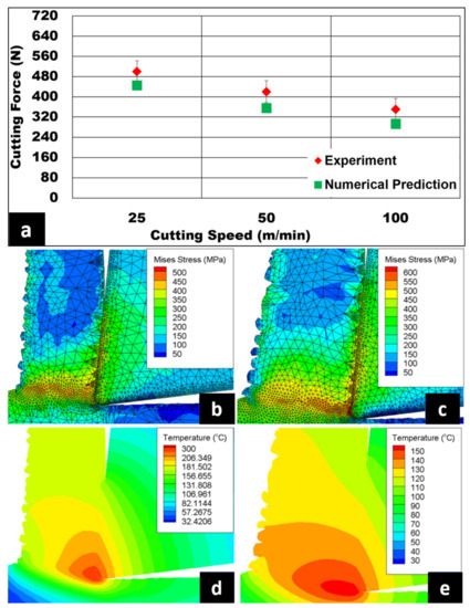 (a) Effect of the variation of the cutting velocity on machining forces (AdvantEdgeTM simulation); 6061/hollow alumina shell syntactic foams (vol% = 10%, h = 0.07 mm, b = 3 mm, dry cut); Von Mises Stress contour at (b) 100 m/min and (c) 25 m/min; temperature contour at (d) 100 m/min and (e) 25 m/min.