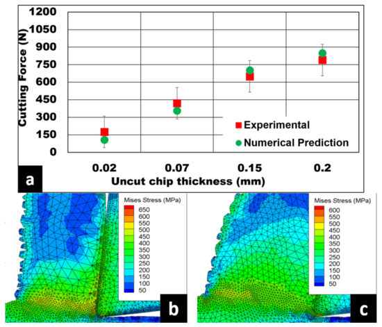 Figure 5a shows the variation of undeformed chip thickness in relation to the generated cutting forces while cutting 6061 with 10% volume fraction of hollow alumina shell reinforcements at 50 m/min cutting speed. An increase in undeformed chip thickness resulted in an increase in the generated cutting forces by an order of 138%. The Von Mises stress contour images at 0.07 mm and 0.2 mm feed rates are presented in Figure 5b,c, respectively. A rise in uncut chip thickness with a constant cutting velocity led to a higher volume of metal cut. For an increase in the metal removal rate (MRR), the length of shear plane was observed to be increased, followed by an increase in the value of the chip thickness ratio. Subsequently, the average shear force as well as the maximum shear stress values were higher, as noted in the numerical simulation. This caused an increase in plastic strain at the primary and secondary shear zones. This means that a rise in uncut chip thickness caused an increase in chip load on the cutting tool, which required a higher magnitude of work to plastically deform the matrix, resulting in higher cutting forces.