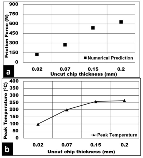The proposed model was used to predict the friction forces caused by chip sliding mechanisms on the tool rake face (Figure 6). The key deformation mechanisms during cutting syntactic foams are plastic deformation of the matrix and debonding and fracturing of the hollow shells followed by densification of the matrix [11,12,13]. The fractured hollow ceramic shells were engaged in two-body and three-body abrasion of the cutting tool, which led to higher friction forces [13]. Both the FE method and experiments showed an increasing trend in the magnitude of the friction force and the force normal to the tool chip interface, with an increase in undeformed chip thickness. At a higher chip thickness ratio, the chip–tool contact length increased, with a subsequent increase in the number of hollow alumina shells at the primary and secondary shear zones. This resulted in alumina hollow shells sliding on the rake face of the tool, and consequently, an increase in friction force was noticed, as shown in Figure 6a. A corresponding increase in cutting temperature was also observed in the shear zones (primary and secondary), as displayed in Figure 6b.