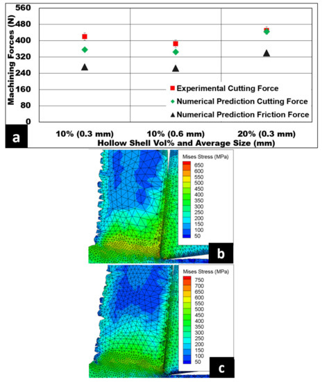 The effect of hollow alumina shell volume percentage and its average size on the generated cutting force is shown in Figure 7a. A marginal increase in the generated cutting forces was noticed with an increasing volume fraction of hollow alumina shell reinforcements for given cutting speed and uncut chip thickness. The shear strength of the foam was expected to rise with an increasing volume fraction of hollow alumina shells. The simulation showed an increase in the magnitude of maximum shear force required to cause plastic deformation in the primary shear zone. A rise in the volume percentage of hollow alumina shells caused an increase in the number of hollow alumina shells along the shear zone pinning the matrix material. This caused higher energy consumption for matrix deformation that led to an increase in the generated machining force, as evidenced by the increased stress contour, as the volume fraction increased from 10% to 20% (Figure 7b,c).