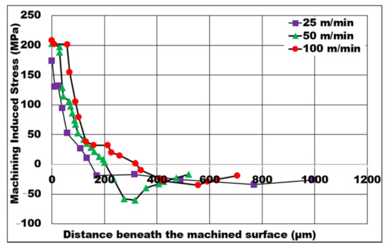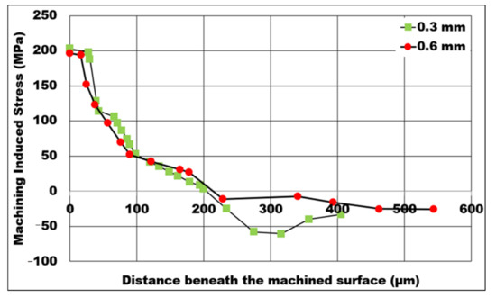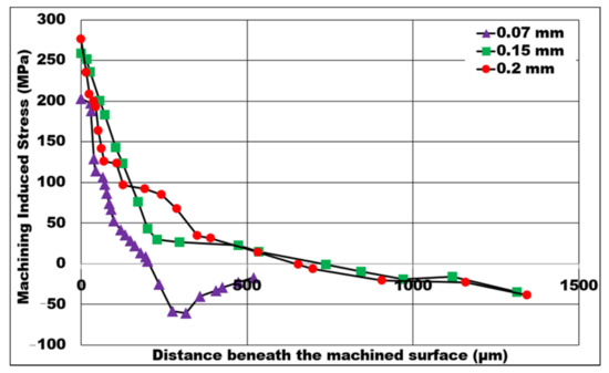 Figure 9 highlights the influence of uncut chip thickness on the simulated machining-induced stresses. With the increase in uncut chip thickness, a greater number of hollow alumina shells came in contact with the rake face of the tool, giving rise to an increased friction force. Subsequently, a surge of temperature in the primary and secondary shear zones was accompanied by a reduced chip compression ratio. As a result, the induced tensile stress magnitude and depth on the machined surface increased, which turned out to be detrimental to the workpiece. The machining-induced tensile stress on the machined surface was minimum (202.88 MPa) in lower uncut chip thickness conditions, which were favorable for this material. An increase in chip load caused an increase in the energy consumed for the plastic deformation of the matrix. It was noted that, as the uncut chip thickness increased, the simulated machining-induced tensile stress distribution increased along with the depth on the machined surface. At a higher uncut chip thickness, a greater number of shells enhanced matrix hardening. This phenomenon promoted matrix plastic deformation by the shearing force. The favorable conditions to increase the compressive nature of machining-induced stress were identified at lower uncut chip thickness values for a given cutting speed.