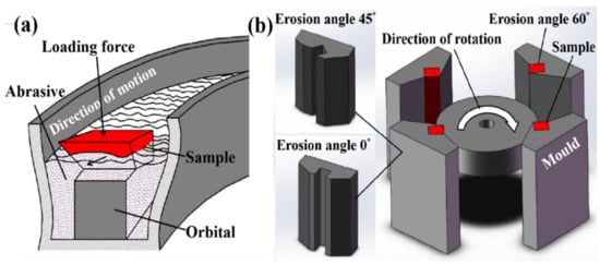 Schematic diagram of the setup for: (a) three-body abrasive wear test, (b) erosion wear test.