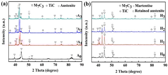 The Image-Pro Plus (Version 6.0, MEDIA CYBERNETICS, Houston, TX, USA) was used to obtain the volume fraction of carbides in the HCCIs. The results are shown in Figure 4a. For the as-cast HCCIs, it is seen that the volume fraction of M7C3 carbide decreases slightly with increasing the TiC content. Specifically, the volume fraction of M7C3 is about 34.1% in A0 specimen while A3 contains 27.2% M7C3 and 9.8% TiC. It has been reported that M23C6 carbide is formed after heat treatment of HCCI [].