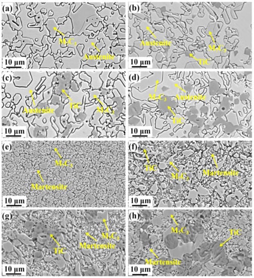 The microstructure of HCCIs in both as-cast and heat-treated states were investigated as shown in Figure 3. The morphology combined with EDS results demonstrate that the microstructure consists of two categories of carbides. The TiC particles are grey and polygonal, while the rod-like particles are eutectic M7C3 carbides. No coarse primary M7C3 grains are observed in all the HCCI specimens. After heat treatment, the matrix can obviously be corroded due to the formation of martensite as shown in Figure 3e–h.