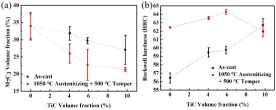 Carbide volume fraction (a) and hardness (b) of the HCCIs.