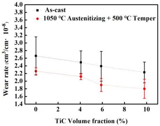 Three-body abrasive wear tests was used to investigate the wear resistance of TiC-strengthened eutectic HCCIs. Figure 5 shows experimental results. It can be seen that the wear rate of HCCIs decreases with increasing TiC fraction in both as-cast and heat-treated state. Specifically, for the as-cast HCCIs, the wear rate decreases from 2.6 to 2.2 cm3/cm·10−8 with the addition of 9.8 vol.% TiC. After heat treatment, the wear rate was further reduced to 1.8 cm3/cm 10−8 as shown in Figure 5. If the wear resistance was presented by the reciprocal of wear rate, the improvement of wear resistance by the heat treatment and the TiC addition can be as high as 50%. The abrasive properties of the HCCIs are consistent with the hardness, as shown in Figure 4b.