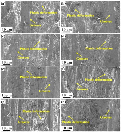 The worn surface after abrasive wear tests were examined to investigate the mass loss mechanisms of the HCCIs. Figure 6 shows the worn surface morphology. The intense plastic deformation and fracture of the samples were reflected by the pits, grooves, and scars in the worn surface as shown in Figure 6. The dominant grooves and scars features indicate that the microcutting and fracture are the major mass loss mechanisms. For comparison, the bright zones in the worn surface were caused by the accumulation of material due to severe plastic deformation. The heat-treated samples exhibit the abrasive wear behavior that is similar to the as-cast samples, as shown in Figure 6e–h.