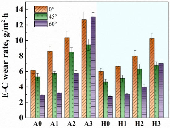 The wear rate of HCCIs under E–C condition is shown in Figure 8. The E–C wear rate (wEC) was determined by the following formula:
