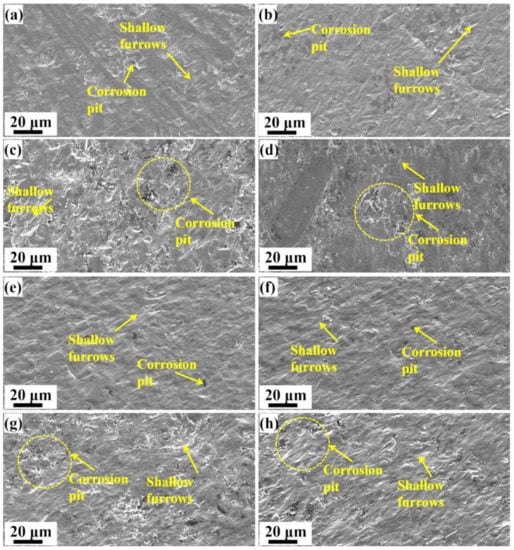 Figure 9 shows the wear surface morphology of different HCCIs. It can be seen that the wear surface exhibits mainly corrosion pits and shallow furrows. The sample was corroded by solution and worn by the abrasive particles (corundum) during the erosion–corrosion process. Therefore, the mass loss of the sample was caused by the synergistic effect of these two factors. As shown in Figure 9, the number of corrosion pits for the as-cast and heat-treated specimens both increase with raising the TiC content. Thus, increasing the TiC content makes the cast iron more susceptible to pitting corrosion. This is consistent with the electrochemical results that the corrosion rate of HCCIs was increased by the introduction of TiC particles. Furthermore, shallow furrows were observed in all the worn surface (Figure 9).