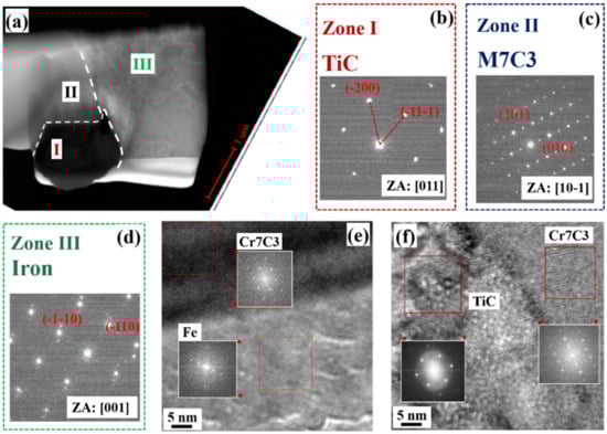 The carbides in H3: (a) TEM bright field image of the specimen; (b–d) the corresponding SAD patterns of TiC, M7C3 and iron matrix, respectively; (e,f) HRTEM of the phase boundaries.