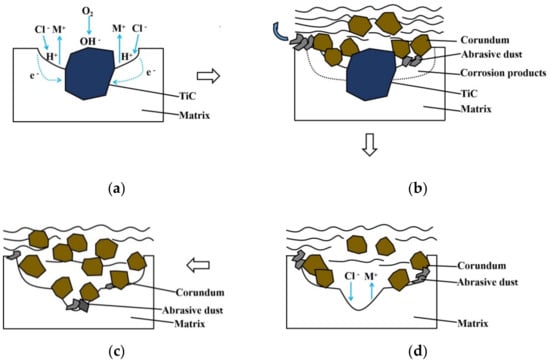 Schematic diagram showing the effect of TiC on erosion–corrosion wear behavior of HCCIs. (a) Corrosion of the matrix; (b) The corroded matrix is worn off; (c) TiC particles are worn off; (d) Further corrosion of the matrix.