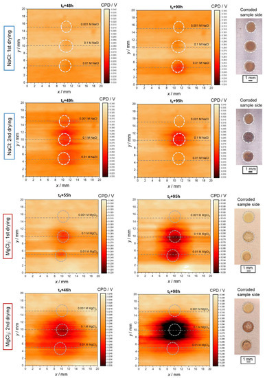 As a general trend, a steady decrease in the CPD could be observed in the first drying interval of the experiment, which indicates a rising hydrogen concentration in the sample. This trend was observed for all salt deposits. However, the intensity of this CPD decrease, reflecting the rise in hydrogen concentration in the sample, was strongly dependent on the type of salt and the salt concentration. The change in CPD detected for MgCl2 deposits was about twice as strong as for NaCl deposits. For both salt types, a similar evolution of CPD minima was measured for 0.1 and 0.01 M salt solutions, which was much stronger compared to the hydrogen entry at the corrosion spot with 0.001 M salt solutions.