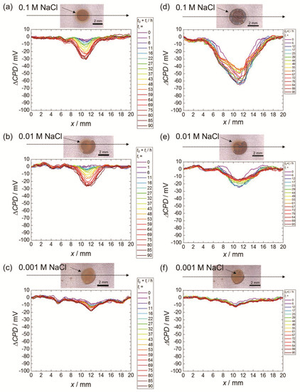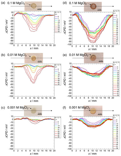 For further data interpretation, CPD line profiles in the x-direction were extracted from the consecutive CPD surface maps. For each of the three salt solution droplets with concentrations of 0.001 M, 0.01 M, and 0.1 M, one x-line profile was extracted from each SKP scan. In order to facilitate the observation and comparison of CPD changes over time, the background, which is represented by the average potential of the initial surface scan before the salt solutions were applied, was subtracted. The resulting graphs for NaCl and MgCl2 are presented in Figure 2 and Figure 3. Each of the extracted line profiles was dominated by one CPD minimum, which was located in close distance to the center of each corrosion spot. For both NaCl and MgCl2, a clear effect of the salt concentration can be observed, with stronger hydrogen insertion for higher salt concentrations. In addition to the concentration, results for MgCl2 showed a stronger decrease in CPD than for NaCl. Concerning the shape of the peaks, a broadening over time was noticeable resulting from the outward diffusion of inserted hydrogen. For a clear localization of hydrogen entry intensity within the droplets, much larger droplets are necessary. This localization of hydrogen entry positions in detail is beyond the scope of the present work, but the subject of current research [39]. However, for some samples, an effect of localized hydrogen entry could be monitored. For 0.01 M and 0.001 M MgCl2 after rewetting, the tendency toward a peak separation, resulting from stronger hydrogen entry at the droplet edges, was visible. This effect can be due to stronger localization of anodic activity and pitting at the droplet edges for lower salt concentrations, as reported in the literature [17]. In contrast, pitting was documented for higher salt concentrations (0.1 M NaCl) to occur over the entire droplet area. This is in accordance with the hydrogen entry activity over the entire droplet region for the highest salt concentrations observed in the SKP measurements.